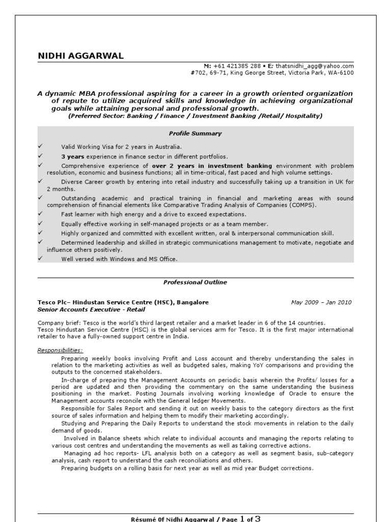 Resume Nidhi Aggarwal Investment Banking Master Of Business